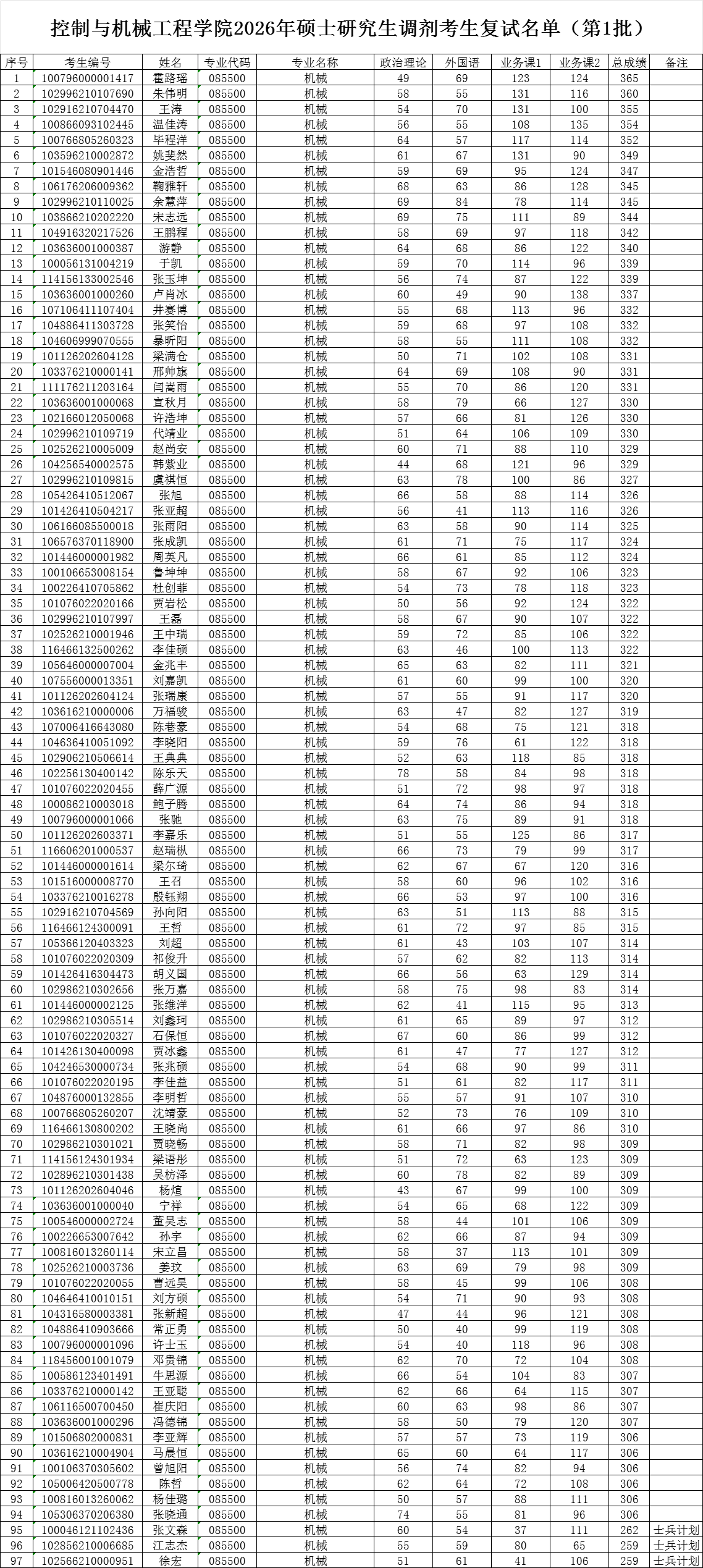 控制与机械工程学院2026年硕士研究生调剂考生复试名单(第1批)机械