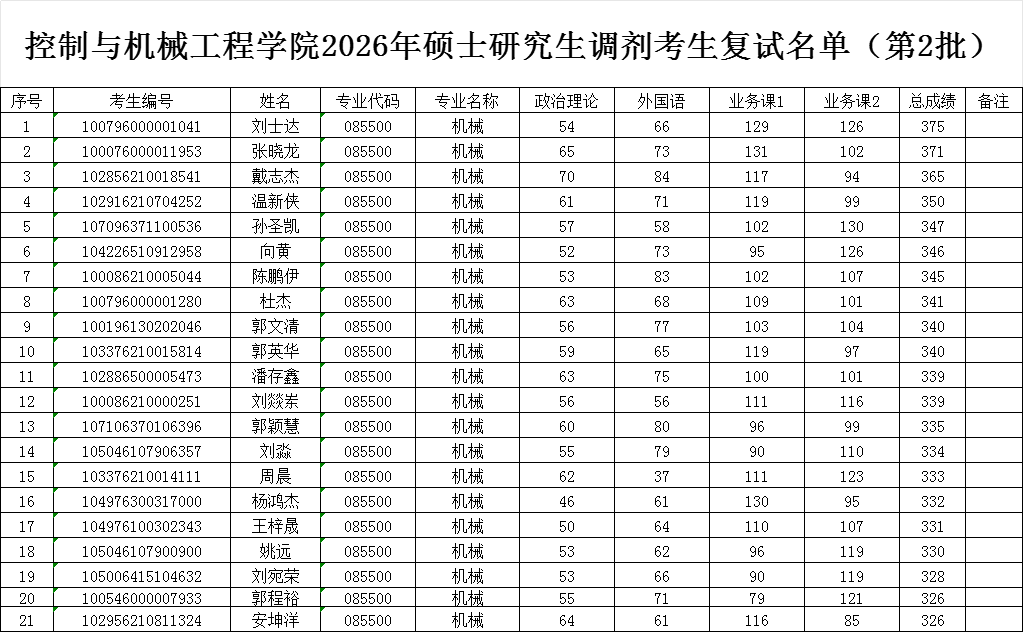 控制与机械工程学院2026年硕士研究生调剂考生复试名单(第2批)机械